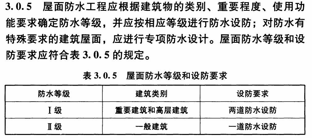 2.1 屋面工程防水类别通用规范是在工程防水设计工作年限内保证屋面不发生渗漏的前提下,从屋面防水的功能要求出发,按渗漏可能造成的影响程度来确定屋面工程防水类别。由于建筑物的使用功能不同,有的建筑物如屋面一旦发生渗漏,可能会引起爆炸,造成伤亡,有的建筑物如屋面渗漏,会使重要设备或珍贵物品遭到破坏,或产品受到污染和损坏;有些建筑如屋面渗漏,会对生产、生活带来极大影响和不便;有些建筑物如屋面渗漏,会使室内装饰污染、霉变,影响使用功能和美观。所以在划分屋面工程防水类别时,按渗漏造成的影响程度,考虑以下几种情况:(1)渗漏后会造成巨大损失,直至人身伤亡;或渗漏后会造成重大的经济损失;(2)渗漏水对人员的健康、财产、建筑使用功能存在一定不利影响;(3)渗漏水不会影响正常使用功能或造成经济损失,确定将屋面防水类别划分为甲类、乙类、丙类三个等级。工程防水类别的确定和适用的工程类型可参考下表由项目设计人员根据工程实际确定。